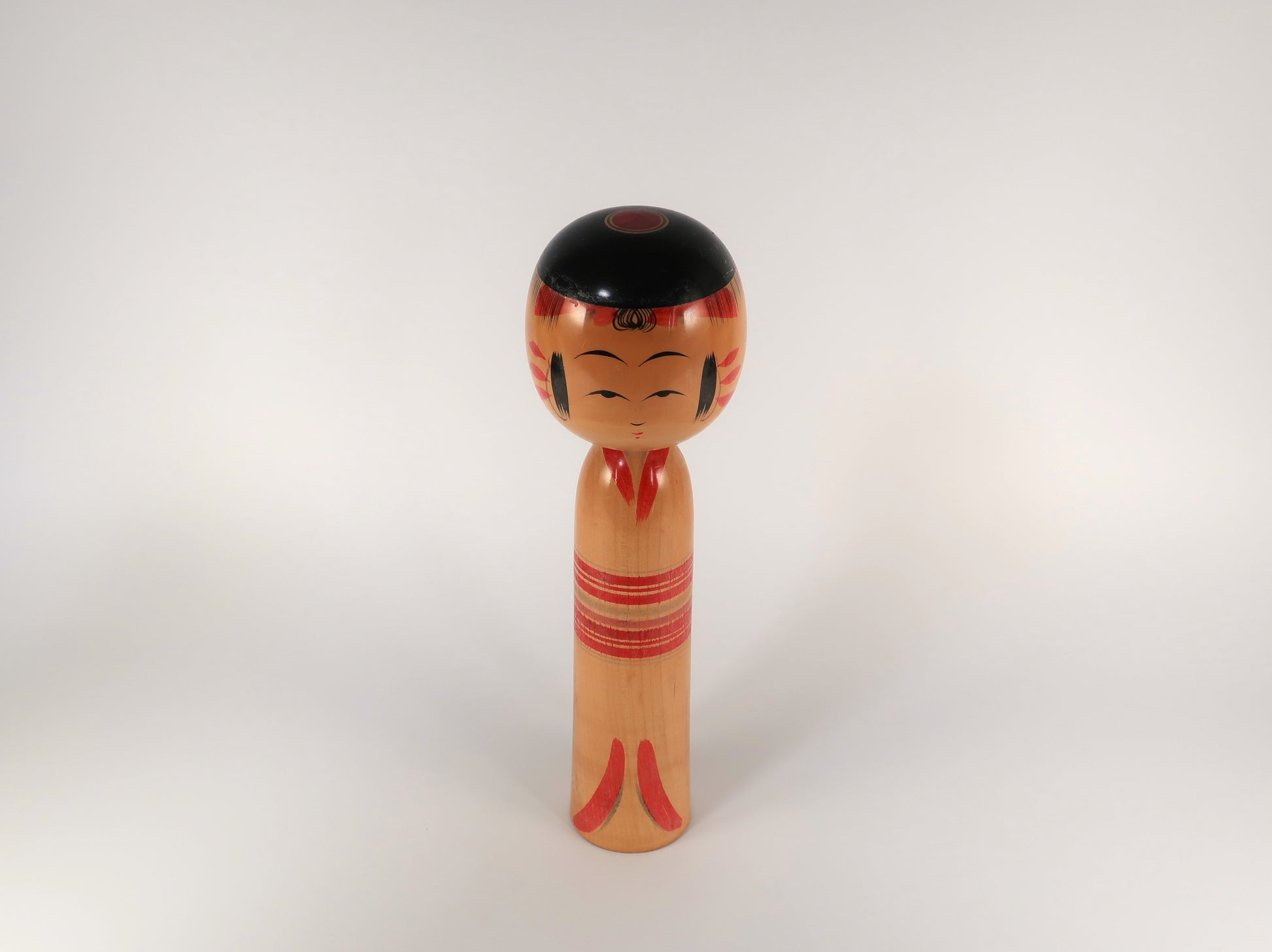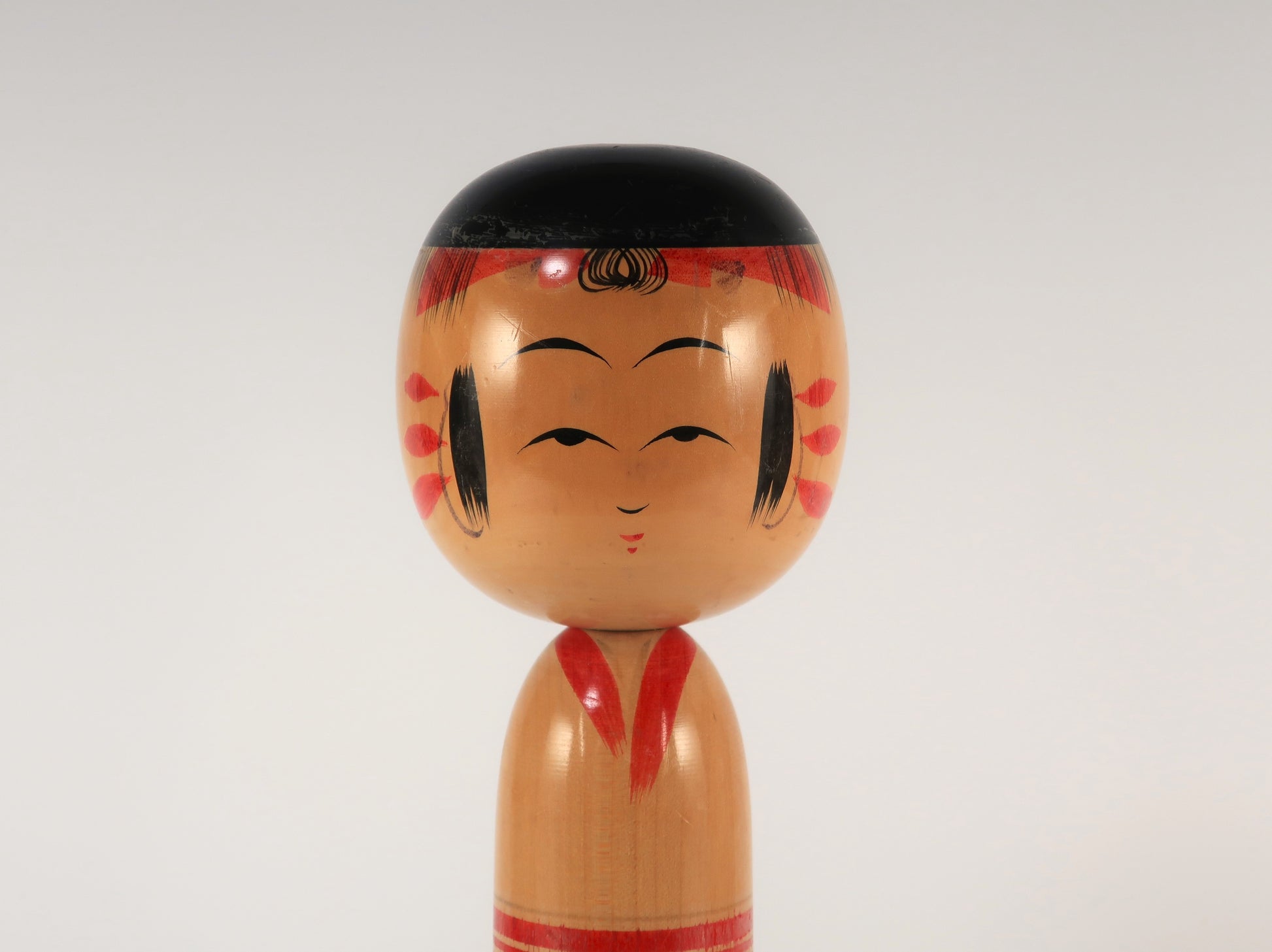 This kokeshi doll was crafted in the 1990s by Tamio Niiyama, an artisan of the traditional Yajirō style from Miyagi, Japan. Her softly rounded face and gentle expression feel as if she’s quietly watching over you, bringing a sense of calm the moment you look at her. The red and black hand‑painted patterns reflect the simple yet strong character of the Yajirō tradition, giving the doll a warm, folk‑art charm that feels both timeless and inviting.